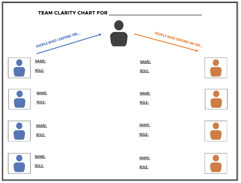 - Create a Clarity Chart for Each Team Member: Begin by gathering your team and mapping out the dependencies within the group. Identify who depends on whom and for what – and highlight the areas of expertise each team member brings. This exercise will provide a clear visual of the team’s structure and help everyone understand how their work fits into the larger picture.